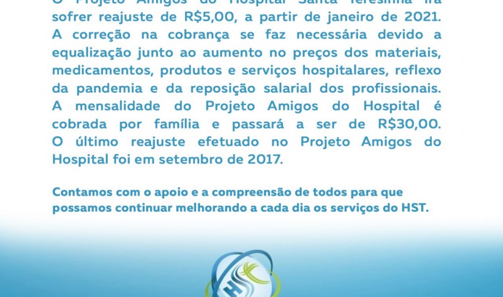O Projeto Amigos do Hospital Santa Teresinha irá sofrer reajuste de R$5,00, a partir de janeiro de 2021. A correção na cobrança se faz necessária devido a equalização junto ao aumento nos preços dos materiais, medicamentos, produtos e serviços hospitalares, reflexo da pandemia e da reposição salarial dos profissionais. A mensalidade do Projeto Amigos do Hospital é cobrada por família e passará a ser de R$30,00. O último reajuste efetuado no Projeto Amigos do Hospital foi em setembro de 2017.